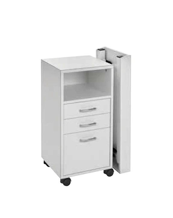 Inclui um armário com três gavetas e uma prateleira superior para manter todos os seus materiais de trabalho organizados e de fácil acesso. Está também equipada com rodízios, facilitando a deslocação pelo salão.